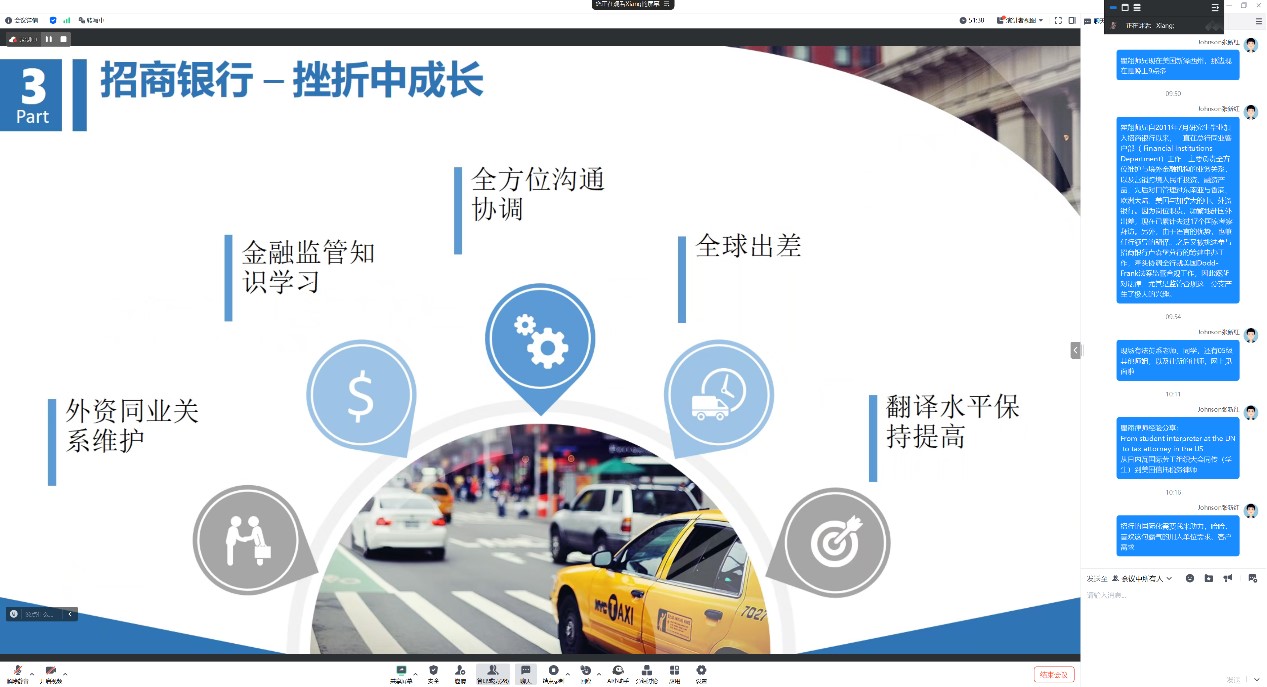 接着,翟翔律师分享了自己在招商银行“在挫折中成长”的工作经历。他指出,工作中既要学习金融监管知识、从事金融业务和机构客户维护工作,又要跟随团队进行必要的翻译。在工作期间,跟随领导访问了25个国家,经历了金融政策法规知识和各国金融界领导人口音等重重挑战,进一步提升了他的工作能力和抗压能力。通过不断挖掘自己的优势与兴趣,翟翔律师决定到美国攻读法律博士。取得学位后,翟翔律师开始在美国执业,确定了职业发展方向。